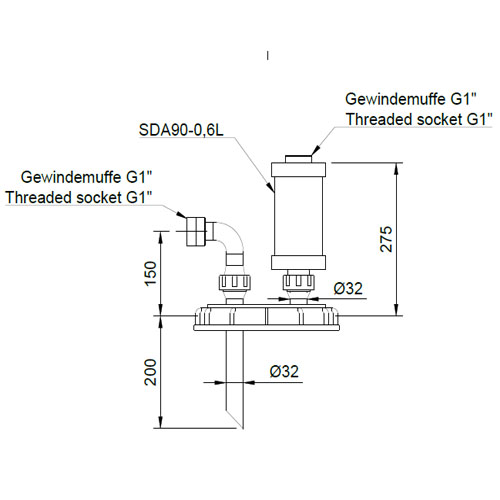 - Befüllanschluss 90° d32 mit Verschraubung mit PE-el /EPDM und PE-el Gewindemuffe G 1“ IG