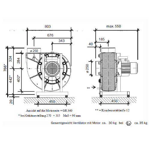 Gehäusestellung GL,  Ausblasrichtung 45° / 90° / 135° / 180° / 270° / 315° /360°