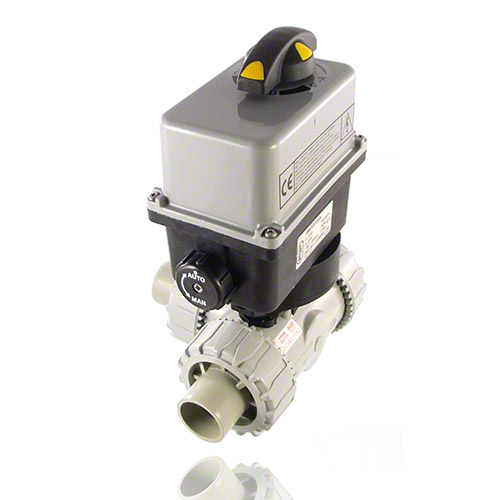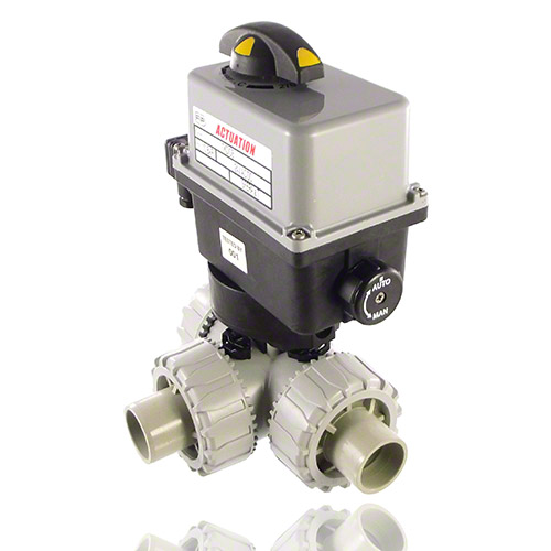 | 3/2-Wege-Kugelhahn aus PVC-C mit elektrischem Stellantrieb mit Endlagenrückmeldern, Handnotbetätigung und optischer Stellungsanzeige Kugel mit L-Bohrung Standardkugelstellung: 1 Stellantriebsdaten: Standard 90-240V / 50-60Hz (AC) ohne Aufpreis 24V AC/DC Andere Spannungen auf Anfrage ***DN50 = PN16 auf Anfrage Anschluss: Klebestutzen Dichtung: PTFE/EPDM |