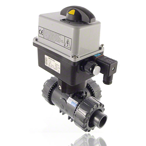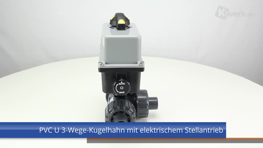 | 3-Wege-Kugelhahn aus PVC-U mit elektrischem Stellantrieb mit Endlagenrückmeldern, Handnotbetätigung und optischer Stellungsanzeige Kugel mit T-Bohrung Standardkugelstellung: 1 Stellantriebsdaten: Standard 90-240V / 50-60Hz (AC) ohne Aufpreis 24V AC/DC Andere Spannungen auf Anfrage ***DN50 = PN16 auf Anfrage Anschluss: Klebestutzen Dichtung: PTFE/EPDM |