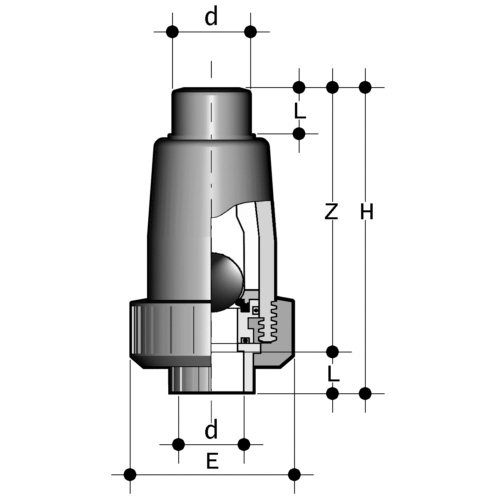 | Anschluss: zum Muffenschweißen Dichtung: FPM Durchfluss nur in einer Richtung möglich Mindestdruck für tropfdichten Abschluss 0,4 bar bei waagrechter Stellung Nur einsetzbar bei Flüssigkeiten mit einer Dichte < 1,2 g/cm3 |