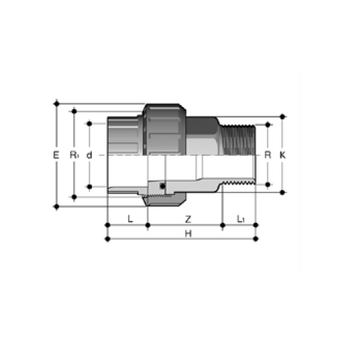 | - Anschluss bis 63 mm: Einlegeteil Messing/Einschraubteil PVC C Klebemuffe - O-Ringdichtung EPDM - Überwurfmutter aus PVC C - Überwurfmutter und Gewindeeinlegeteil mit zylindrischem Gewinde nach ISO 228 |